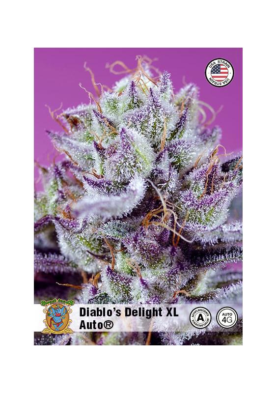 Semillas Diablo’s Delight XL Auto, una variedad autofloreciente, 55% índica / 45% sativa, THC 18% - 24%, sabores de sandía y frutas maduras, efectos eufóricos y relajantes. Disponible en Experiencia Natural.