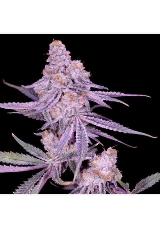 Sus hojas teñidas de un morado intenso contrastan con pistilos naranja brillante y una espesa capa de tricomas cristalinos. Su aspecto nevado y su silueta peculiar la convierten en una de las variedades más atractivas visualmente.