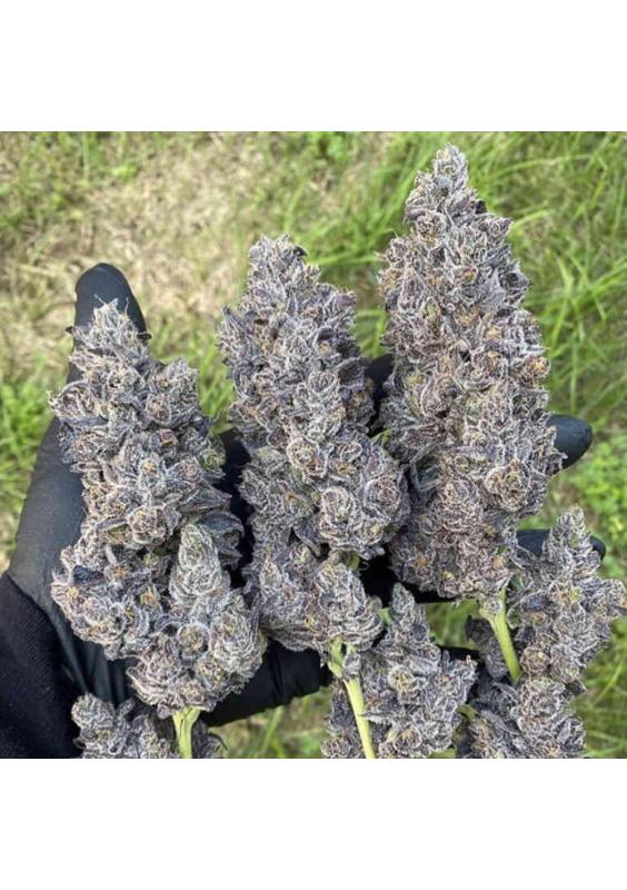 Los cogollos son densos, compactos y cargados de tricomas con brillo escarchado. Su follaje puede presentar verdes intensos, y en algunos fenotipos destellos violetas o azulados bajo ciertas condiciones de cultivo